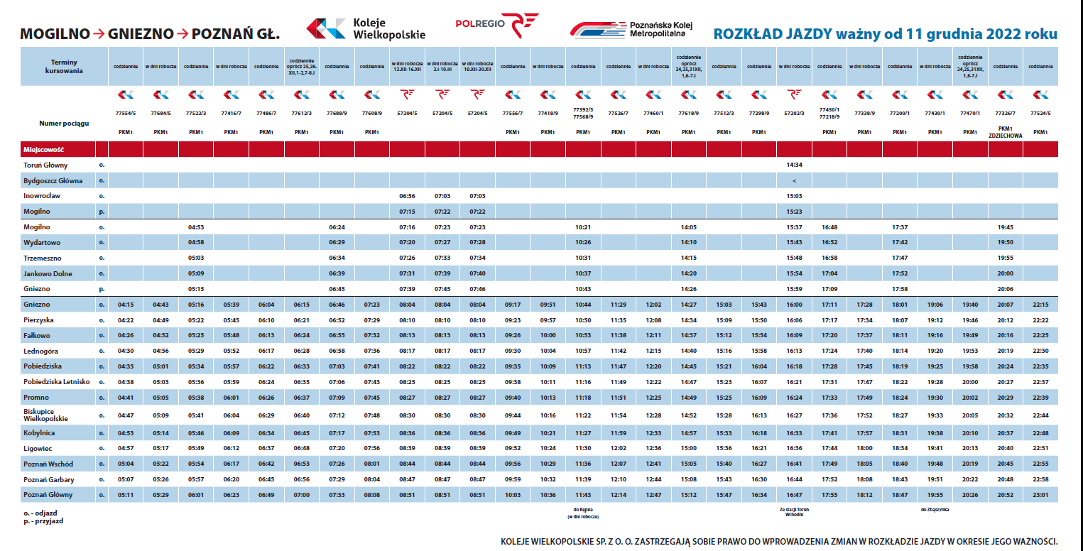 ale prowadzą do ulotek niezawierających (!) żadnego rozkładu jazdy. Coś się rozjechało. Rozkłady jazdy linii PKM są dostępne dopiero na witrynie Kolei Wielkopolskich, jednak można stamtąd pobrać jedynie rozkład w postaci „ulotki” PDF formatu A3, o budowie tabelarycznej, mało strawnej i niewygodnej w obsłudze: